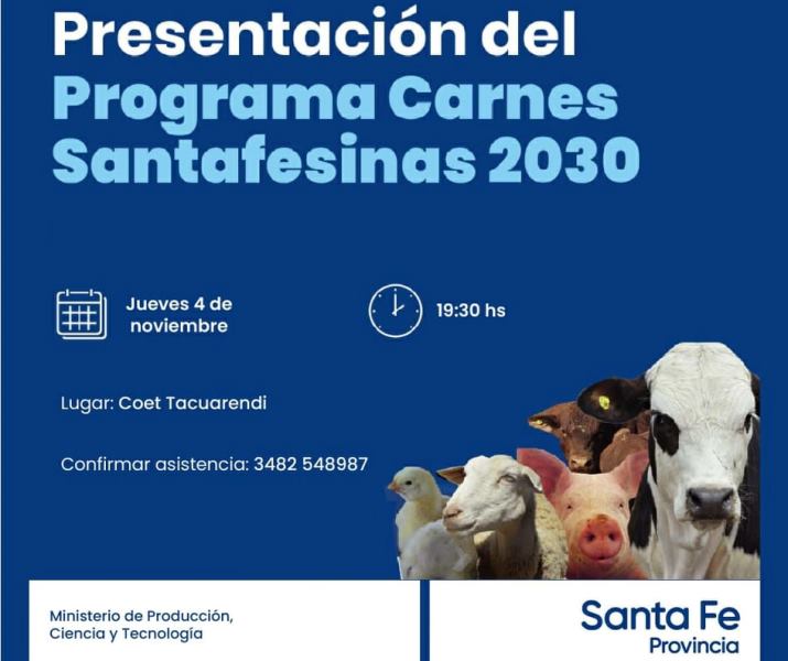 Carnes Santafesinas 2030 es un programa estratégico del Gobierno Provincial que tiene como objetivos principales el crecimiento sustentable de la producción de carnes bovinas, ovinas, caprinas, de pollos y cerdos, la transformación de granos y forrajes en carnes, la generación de empleo y arraigo de jóvenes y familias, la generación de módulos productivos, de empleo y de agregado de valor e incorporación de tecnologías, y el abastecimiento interno y el posicionamiento de nuestras carnes a nivel internacional de nuestras carnes.