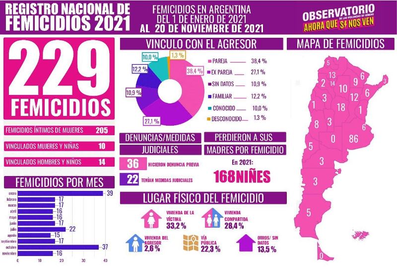 De acuerdo al análisis de medios gráficos y digitales de todo el país del 1 de enero al 20 de noviembre de 2021 se registraron 229 femicidios, y 16 femicidios durante el mes de noviembre.