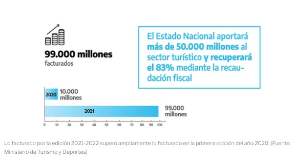 Además, desde el Ministerio sostienen que gracias al programa y la movilización de $99.000 millones de pesos de ahorros de los particulares, se inyectará, a través del crédito del 50% que volverá a ser invertido en turismo, cerca de $51.000 millones al sector que a su vez recuperará el 83% mediante la recaudación de impuestos.