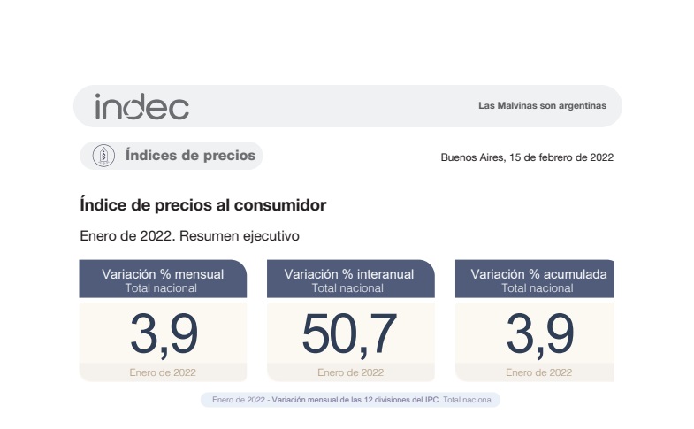 La inflación aumentó 3,9% en enero en comparación con diciembre de 2021, según datos del INDEC. Es su mayor nivel en 9 meses.