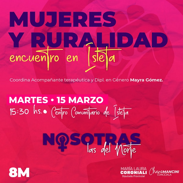 El martes 15 de marzo se realizará a las 15:30 hs. en el Centro Comunitario de Isleta (Villa Ocampo) “Mujeres y Ruralidad: encuentro en Isleta”. Estará coordinado por la Acompañante Terapéutica y Dipl. en Género, Mayra Gómez, donde se entrelazarán charlas, testimonios y reflexiones vinculadas a la temática.