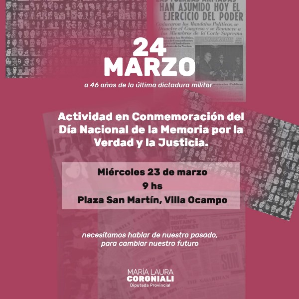 La Legisladora Provincial, María Laura Corgniali, invita a la ciudadanía de Villa Ocampo a participar de la actividad, en plaza San Martín en conmemoración por el Día Nacional de la Memoria por la Verdad y la Justicia al cumplirse los 46 años de la instauración de la última dictadura militar en nuestro país.