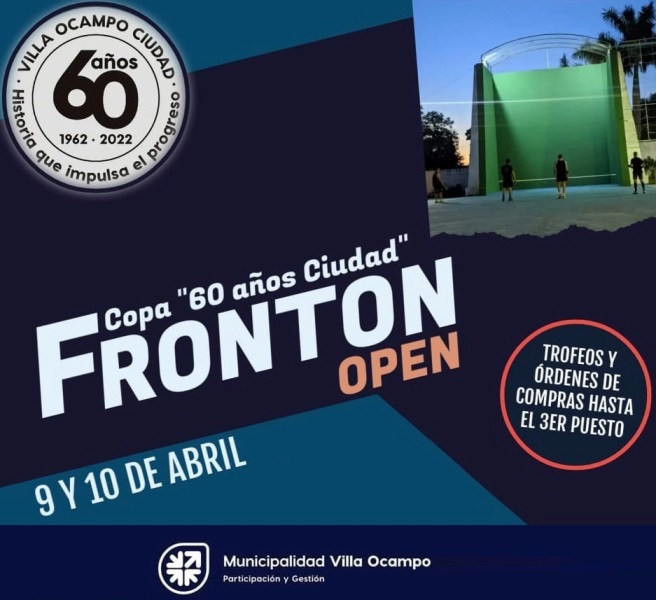 La Dirección de Deportes de la Municipalidad de Villa Ocampo invita a participar del Torneo de Frontón “Copa 60 Años Ciudad”, que se realizará los días 9 y 10 de abril en el playón deportivo del Complejo Arno.