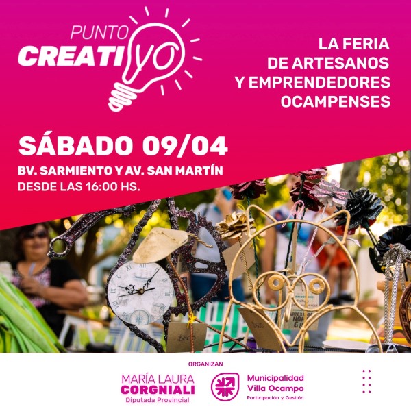 La Legisladora Provincial, María Laura Corgniali, convoca a las y los artesanos y emprendedores de Villa Ocampo a participar de una nueva edición de Punto Creativo a realizarse el sábado 9 de abril desde las 16 hs. en Bv. Sarmiento y Av. San Martín.