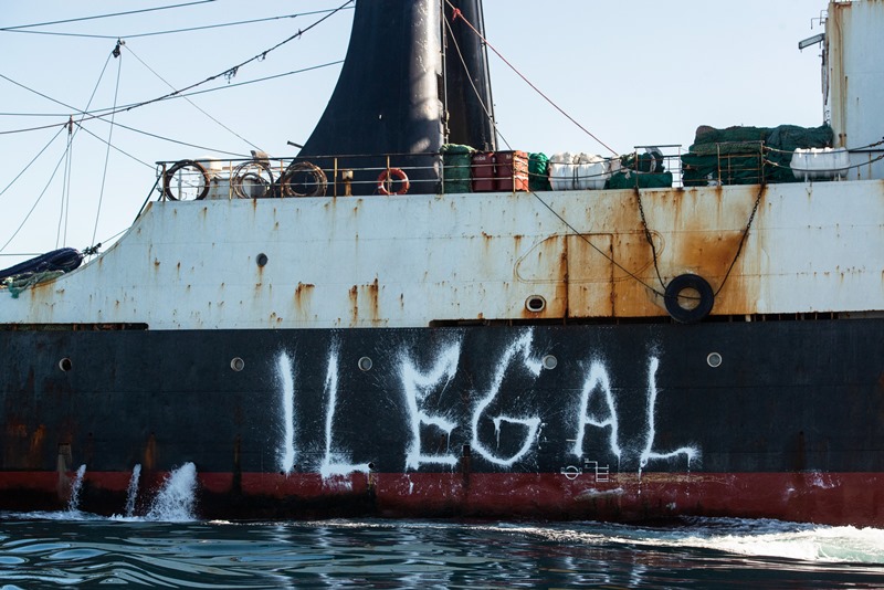 Ilegal, es la palabra que los activistas de Greenpeace pintaron sobre el casco de un barco que realizaba pesca de arrastre en el Agujero Azul. Ocurrió fuera de la zona económica exclusiva argentina aunque sí sobre la plataforma extendida de jurisdicción nacional, a unos 500 kilómetros de Puerto Madryn. Los activistas denunciaron los impactos de la pesca de arrastre, que es comparable a un desmonte en el fondo marino.