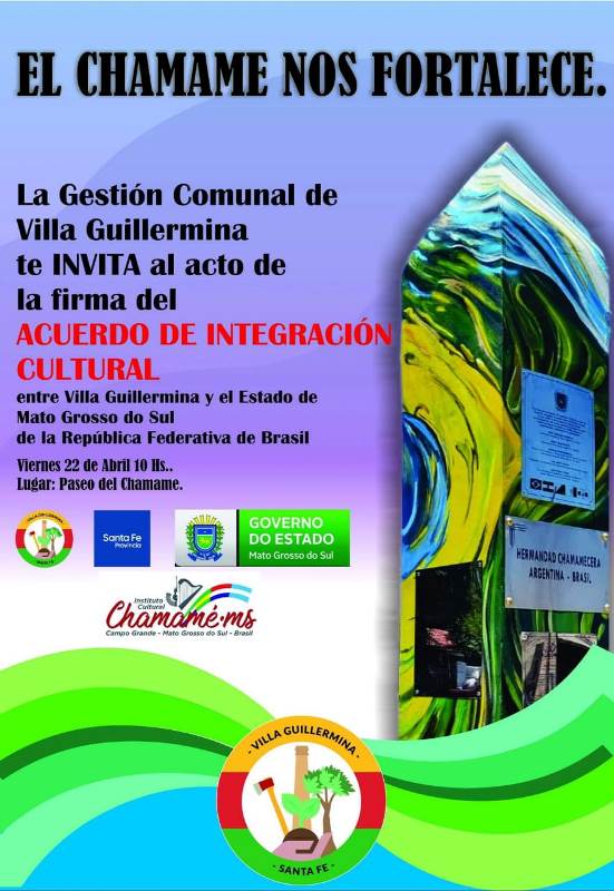 La presidente Comunal, señora Nancy Avalos invita a la firma del ACUERDO DE INTEGRACIÓN CULTURAL entre las localidades de Villa Guillermina y el Estado de Mato Grosso do Sul de la República Federativa de Brasil, el próximo viernes 22 de abril a las 10 horas, en el Paseo del Chamamé.