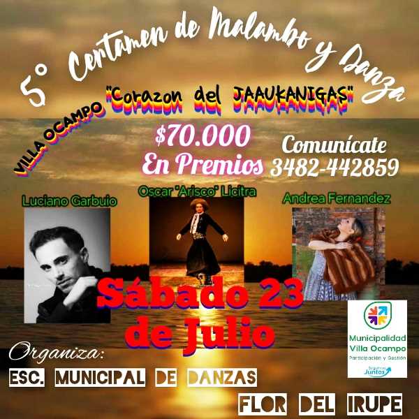 La Secretaría de Cultura y Comunicación de la Municipalidad de Villa Ocampo informa que la Escuela Municipal de Danzas “Flor del Irupé” está organizando el 5º Certamen de Malambo y Danza “Corazón del Jaaukanigás”, a llevarse a cabo el sábado 23 de julio en el estadio de Bomberos Voluntarios.