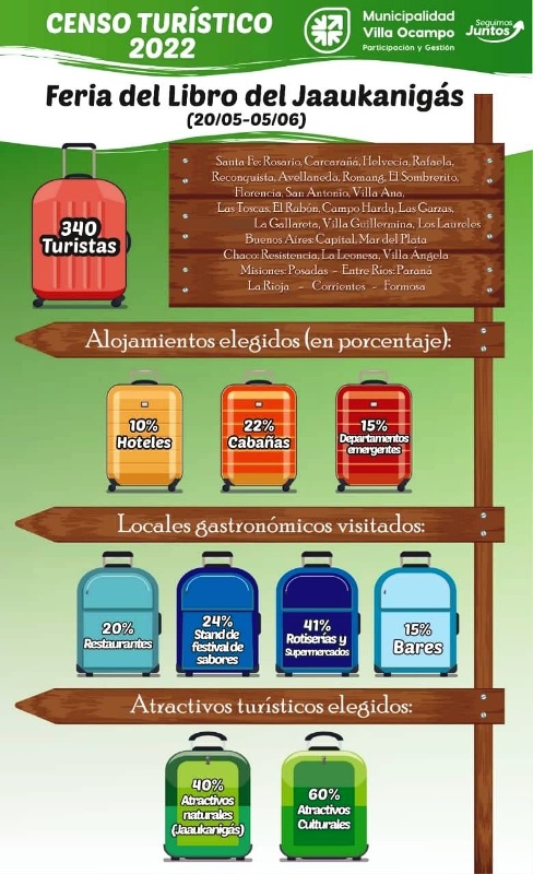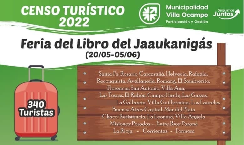 La Secretaría de Sistemas Productivos y Medio Ambiente de la Municipalidad de Villa Ocampo informa que desde la Dirección de Turismo, junto a los alumnos de la carrera de Tecnicatura Superior en Turismo del Instituto 4026 “Sma. Virgen Niña”, se llevó a cabo un censo turístico durante los 17 días en que se desarrolló la 3º Feria del Libro del Jaaukanigás, con el fin de detectar el movimiento de visitantes que generó este mega evento, convertido en uno de los atractivos de turismo cultural que tiene nuestra ciudad en el calendario anual.