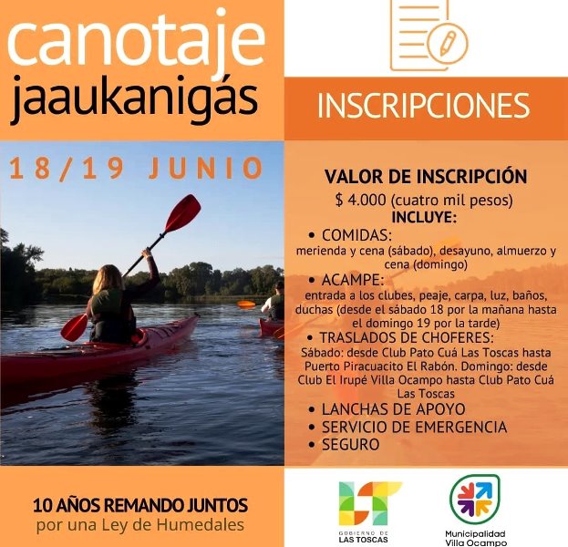 Desde la Dirección de Turismo de la Municipalidad de Villa Ocampo, Las Toscas, más las comunas de El Rabón y Tacuarendí invitan a participar de la «10ª edición del Canotaje del Jaaukanigás», a realizarse este sábado 18 y domingo 19 de junio.