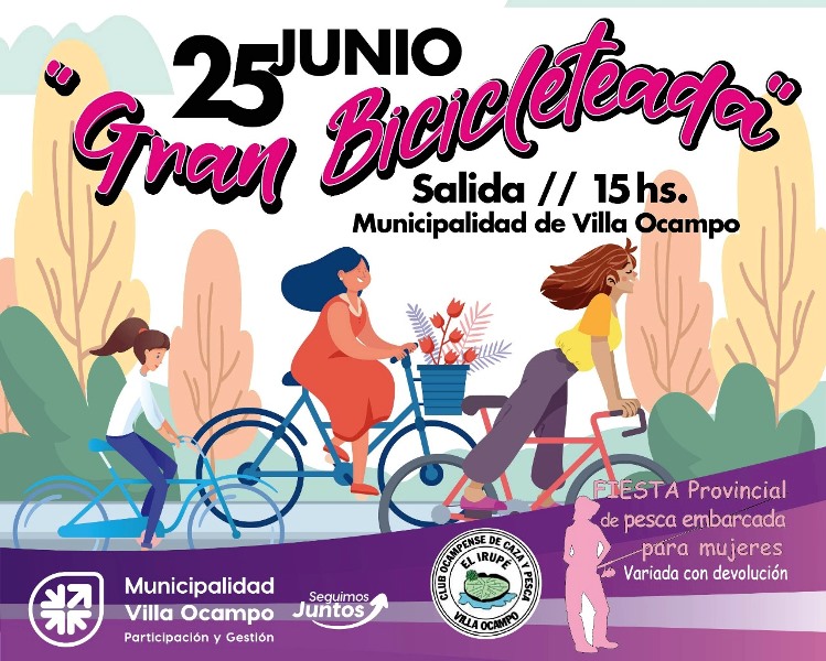 La Dirección de Deportes de la Municipalidad de Villa Ocampo invita a la Gran Bicicleteada Promocional de la 8º Fiesta Provincial de Pesca Embarcada para Mujeres, bajo el lema “No a la violencia de género y a la trata de personas”.