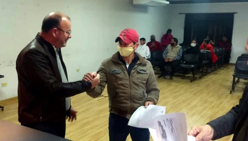 El intendente Enrique Paduán, junto a la secretaria de Desarrollo Social de la Municipalidad de Villa Ocampo, Ana Belén Fariz; y al responsable del Área de Coordinación y Gestión Municipal, Bernardo Villalba, hicieron entrega de 27 nuevas pensiones sociales Ley 5110 tramitadas desde el municipio.