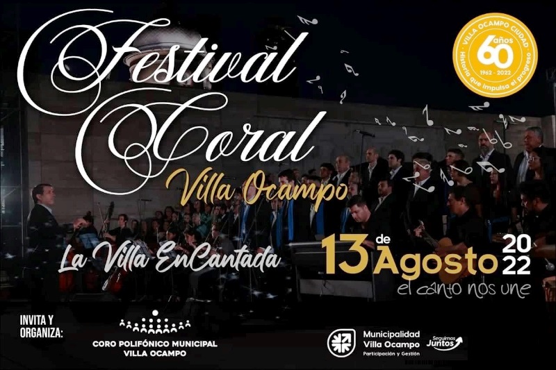 La Secretaría de Cultura y Comunicación de la Municipalidad de Villa Ocampo invita al Festival Coral “La Villa EnCantada” que se llevará a cabo este sábado 13 de agosto, a partir de las 21:00 Hs. en la Sala Bordó del Complejo “Arno”.