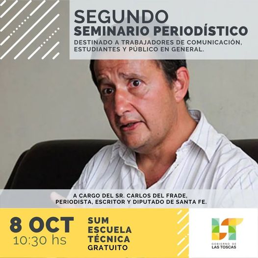 El Sábado 8 de Octubre, en el marco de la Expo Las Toscas Comercio e Industria, Carlos Del Frade, dará el 2° de 3 Seminarios Periodístico en esta ciudad.