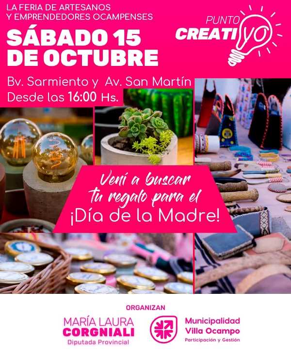 Se convoca a todos los artesanos y emprendedores cuentapropistas locales, a inscribirse para participar de una nueva edición de la feria “Punto CreatiVO”, celebrando el Día de la Madre, que se llevará a cabo el sábado 15 de octubre, a partir de las 16 horas, en el Paseo “Félix Masín” (Bv. Sarmiento y Av. San Martín).