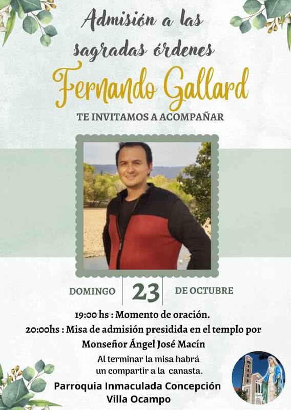 El domingo 23 de octubre, en la Misa vespertina de las 20:00 horas, el seminarista Fernando Gallard de nuestra parroquia, recibirá la admisión a las Sagradas Ordenes. Este paso lo habilita a seguir el camino de preparación al sacerdocio ministerial.