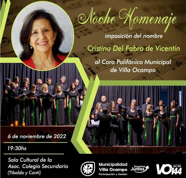 La Secretaría de Cultura y Comunicación de la Municipalidad de Villa Ocampo invita a la Noche Homenaje Imposición del Nombre “Cristina del Fabro de Vicentín” al Coro Polifónico Municipal, que se llevará a cabo el domingo 6 de noviembre, a las 19:30 Hs. en la Sala Cultural de la Asociación Colegio Secundario (Tibaldo y Conti).