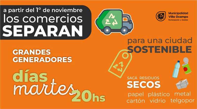 La Secretaría de Sistemas Productivos y Medio Ambiente de la Municipalidad de Villa Ocampo informa que, en el marco del Plan de Acción por el Clima, a partir de mañana martes 1º de noviembre comienza a implementarse el nuevo servicio de Recolección Diferenciada de Residuos Reciclables para Grandes Generadores (comercios, empresas e instituciones).
