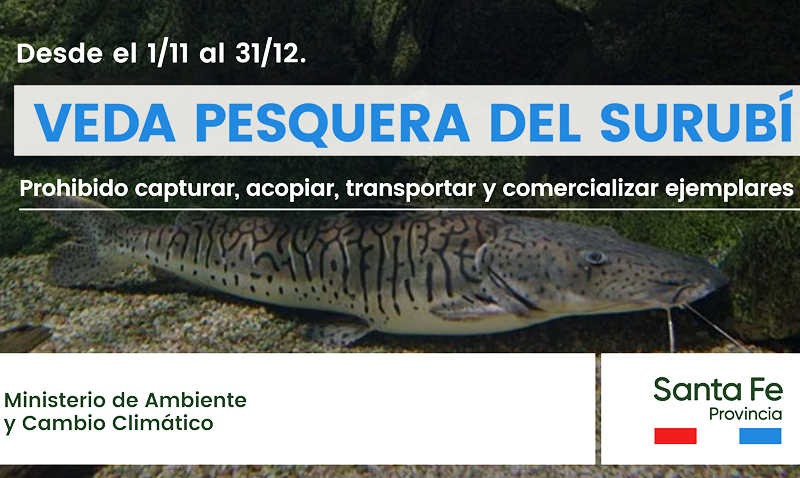 El gobierno de la provincia de Santa Fe recuerda que desde el 1 de noviembre, y hasta el 31 de diciembre de 2022 inclusive, regirá el período de veda para la pesca comercial y deportiva del surubí pintado (pseudoplatystoma coruscans) y el surubí atigrado o rollizo (pseudoplatystoma fasciatum).