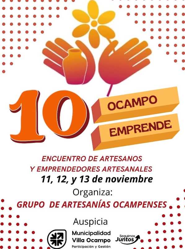 El intendente Enrique Paduán junto al grupo “Artesanías Ocampenses” invitan a la presentación de lo que será la 10ª edición del “Ocampo Emprende”, que se realizará desde este viernes 11 al domingo 13 de noviembre en Plaza Belgrano y Paseo de la Amistad, con acceso libre y gratuito.