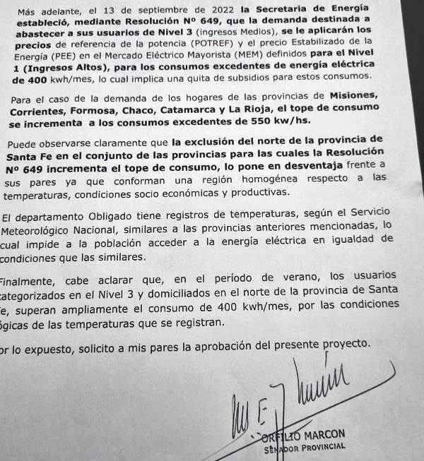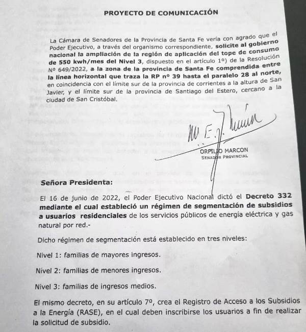 A partir del dictado del Decreto Nacional N 332 que estableció la segmentación de tarifas, logramos la aprobación del proyecto donde solicitamos al gobierno provincial la gestión ante las autoridades nacionales para que incluya al norte de la provincia en la franja de 550 kw de consumo mensual, a fin de lograr que conserve el beneficio del subsidio a la energía eléctrica.