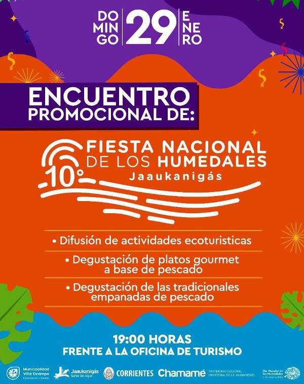 La Dirección de Turismo de la Municipalidad de Villa Ocampo, junto a prestadores turísticos locales y emprendedores gastronómicos, realizarán un Encuentro Promocional de la 10º Fiesta Nacional de los Humedales “Jaaukanigás”, este domingo 29 de enero, a partir de las 19:00 Hs. frente a la Oficina de Turismo (acceso principal de la ciudad).