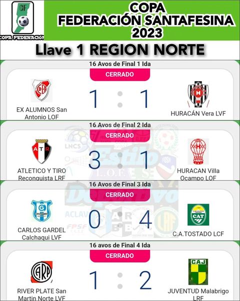 Estos son los resultados de los partidos de ida de los 16avos de Final de la Copa Federación 2023, restando jugarse un partido el día Miércoles 1 de Febrero y otro encuentro que fue suspendido ya que el equipo local no aviso que tenia la cancha suspendida, lo resolverá el Tribunal de la F.S.F.