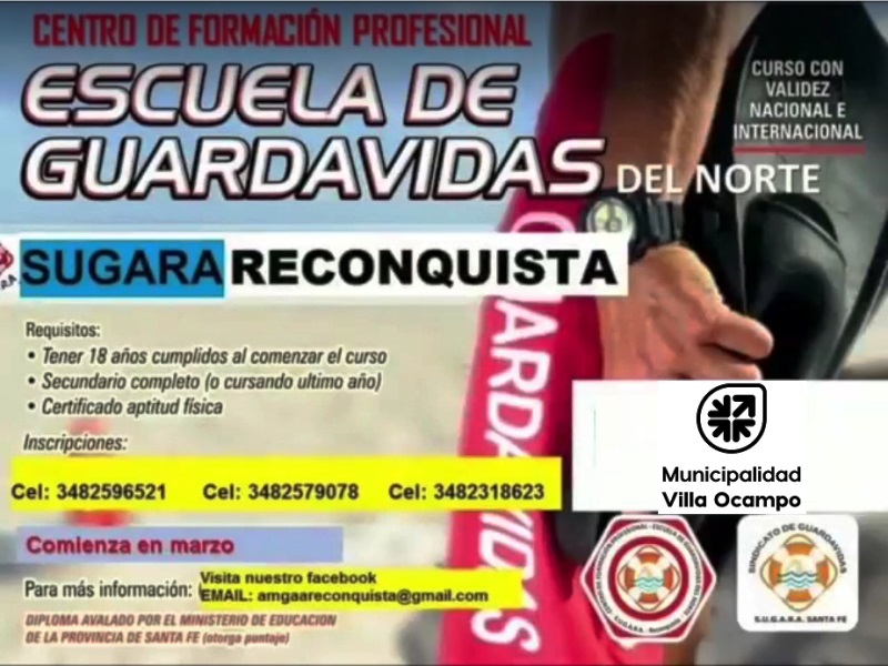 La Dirección de Deportes de la Municipalidad de Villa Ocampo informa que el Centro de Formación Profesional SU.GA.RA (Sede Reconquista) abrió la inscripción para la Carrera Anual de Guardavidas Profesional dictada en la ciudad de Reconquista por la Escuela de Guardavidas del Norte.