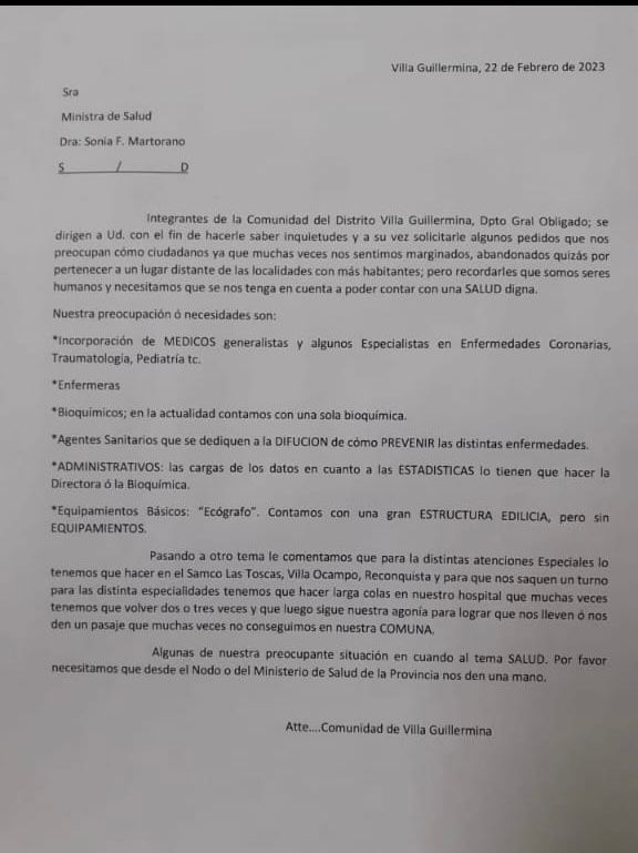 Luego de que se hayan manifestados este domingo pasado frente al Samco local y repitiendo el reclamo este miércoles, asegurando que hay muchos más contagios de los informados y pidiendo información clara a las autoridades, ya que también aseguran se sienten «abandonados» y por lo tanto, exigieron políticas concretas para frenar la multiplicación de casos, un equipo del gobierno de la provincia, se apersonó a la localidad de Villa Guillermina, teniendo la presencia del subsecretario de Promoción de la Salud, Sebastián Torres, quien en conferencia de prensa en Villa Guillermina, explicó las intervenciones que se llevan adelante.