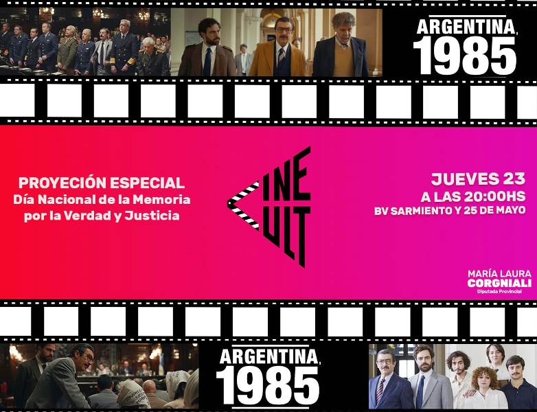 María Laura Corgniali invita a toda la comunidad a participar de la proyección de la película “Argentina 1985” en el marco del Día Nacional de la Memoria por la Verdad y la Justicia, en la esquina de 25 de Mayo y Bv. Sarmiento.
