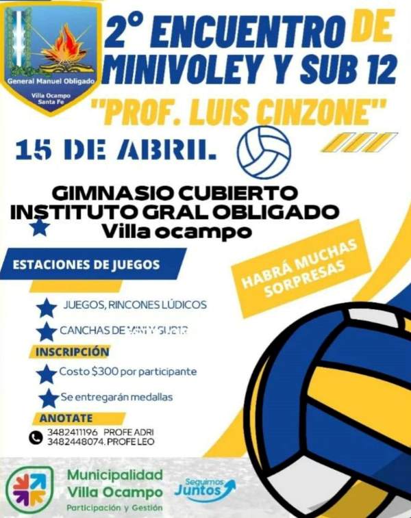 La Dirección de Deportes de la Municipalidad de Villa Ocampo invita a participar del 2º Encuentro de Minivoley y Sub 12 “Prof. Luis Cinzone”, a realizarse el sábado 15 de abril, en el gimnasio cubierto del Instituto Gral. Manuel Obligado.