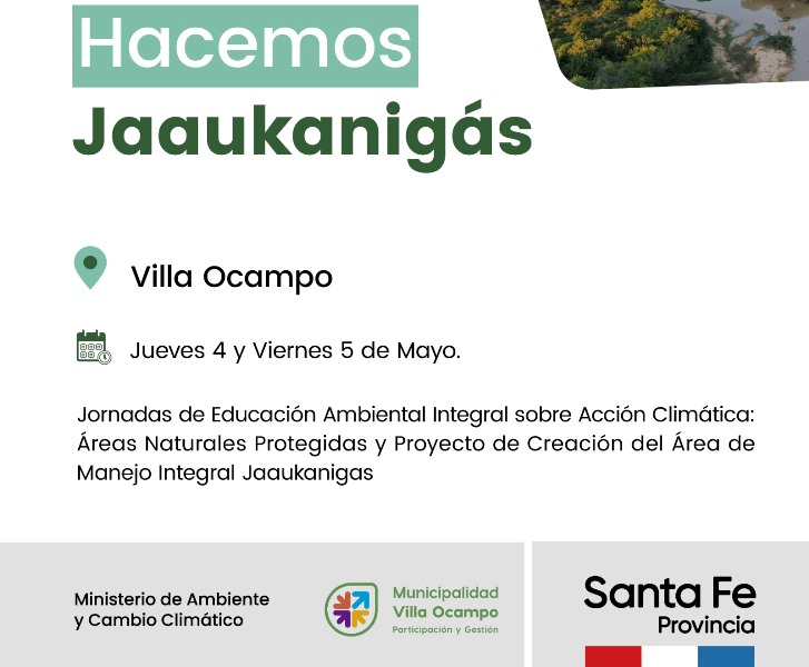 La Secretaría de Cultura y Comunicación de la Municipalidad de Villa Ocampo informa que la Subsecretaría de Protección a la Naturaleza del Ministerio de Ambiente y Cambio Climático de la Provincia brindará en los establecimientos educativos de nuestra ciudad una serie de talleres didácticos “Hacemos Jaaukanigás”, este jueves 4 y viernes 5 de mayo.