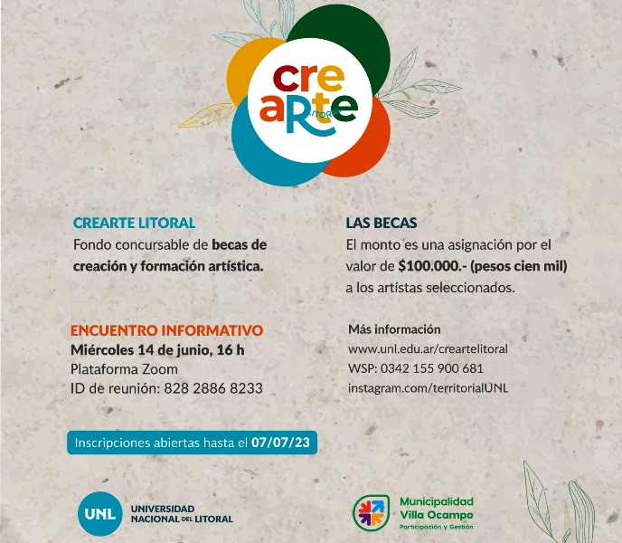 El “Crearte Litoral 2023” es una iniciativa de la Universidad Nacional del Litoral que, junto a los gobiernos locales de los departamentos General Obligado, Vera, San Javier, Garay, San Jerónimo, Las Colonias y Castellanos, y en el marco del Programa Regional de Promoción de las Artes para la Transformación Social del Litoral, crean el fondo concursable de becas de creación y formación artística con el fin de contribuir al desarrollo sostenible del patrimonio natural y cultural de la Región Litoral Centro.