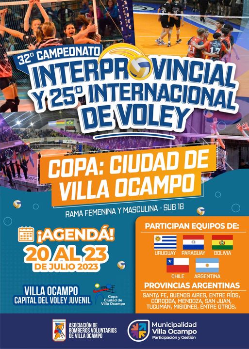 Villa Ocampo se prepara para vivir uno de los mayores eventos deportivos del norte santafesino, del 20 al 23 de julio será sede del 32º Campeonato Interprovincial y 25º Internacional de Vóley “Copa Ciudad de Villa Ocampo”, organizado en forma conjunta por la Asociación Bomberos Voluntarios y la Municipalidad de Villa Ocampo.