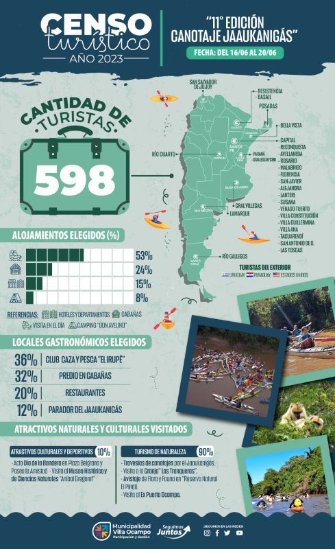 La Secretaría de Sistemas Productivos y Medio Ambiente de la Municipalidad de Villa Ocampo informa que se llevó a cabo un nuevo censo turístico durante el pasado fin de semana extra largo, organizándose en la región el 11º Canotaje del Jaaukanigás.
