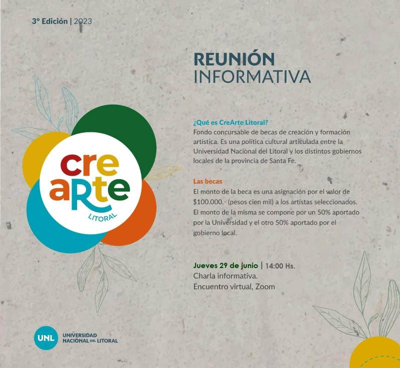 El «Crearte Litoral 2023» es una iniciativa de la Universidad Nacional del Litoral que, junto a los gobiernos locales de los departamentos General Obligado, Vera, San Javier, Garay, San Jerónimo, Las Colonias y Castellanos, y en el marco del Programa Regional de Promoción de las Artes para la Transformación Social del Litoral, crean el fondo concursable de becas de creación y formación artística con el fin de contribuir al desarrollo sostenible del patrimonio natural y cultural de la Región Litoral Centro.