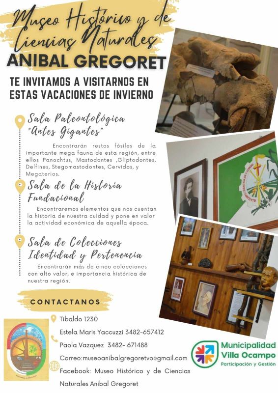 La Secretaría de Cultura y Comunicación de la Municipalidad de Villa Ocampo invita a participar de las visitas guiadas en el Museo Histórico y de Ciencias Naturales «Aníbal Gregoret», con su exclusiva Sala Paleontológica «Antes Gigantes», durante las vacaciones de invierno, del 17 al 28 de julio en horario especial de 9:00 a 12:00 y de 16:00 a 19:00 horas.