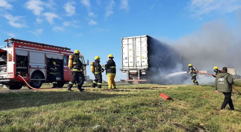 Arribados divisaron un semiremolque, cargado con contenedor térmico transportando productos cárneos, precintado, prendiéndose fuego.