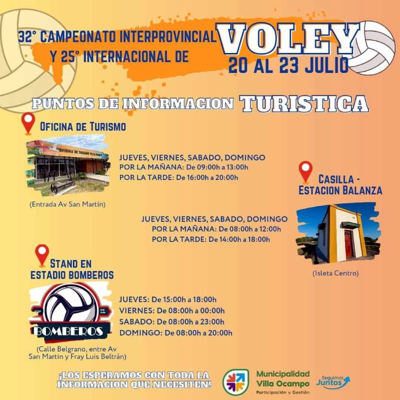 La Dirección de Turismo de la Municipalidad de Villa Ocampo informa que desde este jueves 20 al domingo 23 de julio, durante el desarrollo del 32º Campeonato Interprovincial y 25º Internacional de Vóley «Copa Ciudad de Villa Ocampo», junto a los estudiantes de la carrera de Tecnicatura Superior en Turismo, se realizará un operativo de información turística sobre las distintas propuestas que ofrece nuestra ciudad y zona del humedal Jaaukanigás.