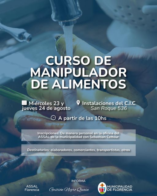 La agencia santafesina de seguridad alimentaria de la Municipalidad de Florencia (ASSAL) comunica la realización del curso de manipulador de alimentos.