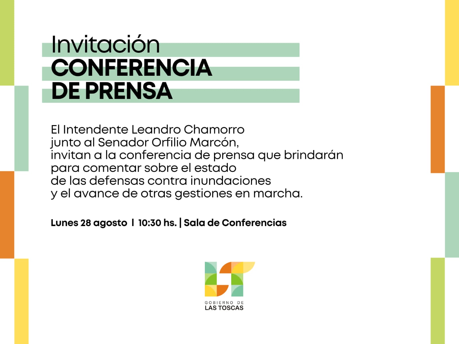 El Intendente Leandro Chamorro, junto al Senador Orfilio Marcón, invitan a toda la comunidad de Las Toscas a la Conferencia de Prensa que se realizará este día lunes 28 a las 10:30hs. en la Municipalidad.