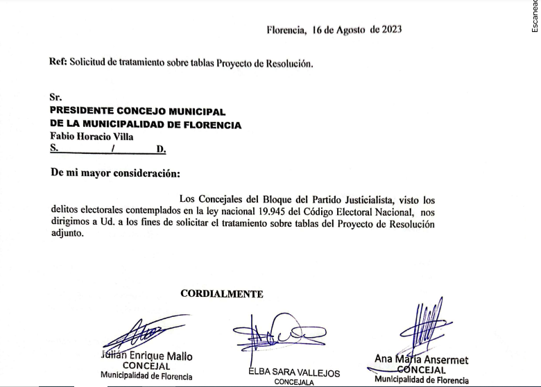 Los ediles justicialistas, del actual concejo municipal de la ciudad de Florencia, solicitan la renuncia del concejal Fabio Villa, quien fuera denunciado en la justicia federal por violar la veda electoral el domingo 13 de agosto.