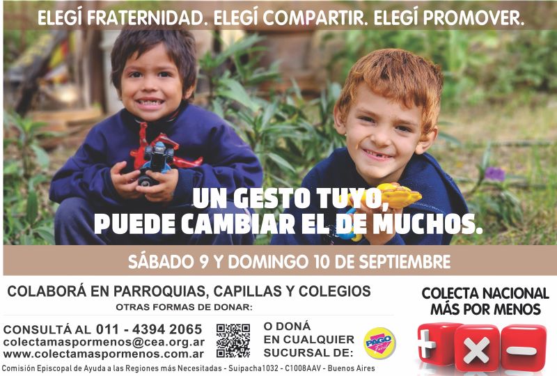 Este sábado 9 y domingo 10 de septiembre se realizará la tradicional Colecta Nacional Más por Menos en todas las Parroquias, Capillas, Colegios e Instituciones Católicas del país.