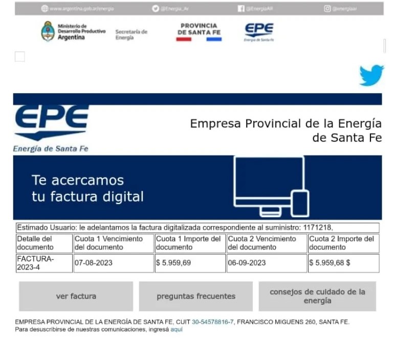 La EPE solicita no hacer clic en el enlace «descargar factura» que figura en el correo electrónico apócrifo y cualquier duda, viabilizarla por los canales habituales de comunicación: www.epe.santafe.gov.ar/oficina-virtual.