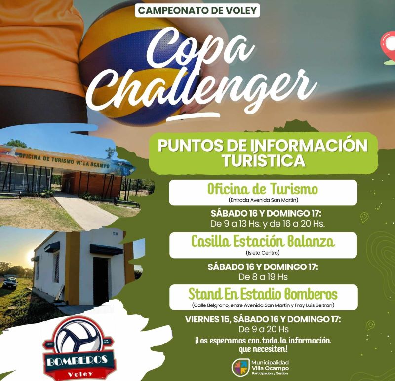 La Dirección de Turismo de la Municipalidad de Villa Ocampo informa los puntos de información turística que se habilitarán este fin de semana, durante el desarrollo de la «Copa Challenger de Voley». Varias propuestas turisticas.