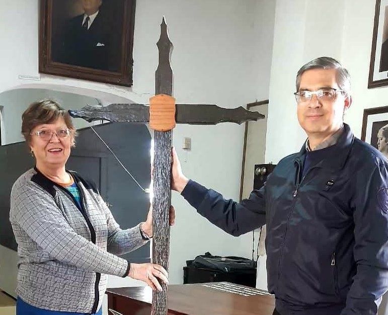 La directora de los museos municipales, Estela Yaccuzzi, recibió del cura párroco Rolando González la cruz del antiguo campanario del Templo Parroquial de nuestra ciudad, como donación para ser preservada en el Museo Histórico y de Ciencias Naturales «Aníbal Gregoret».