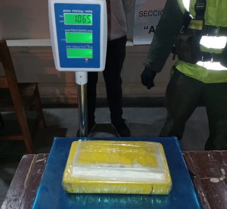 Informaron que, a los agentes de seguridad les llamó la atención, la actitud sospechosa del pasajero, quien al ver el control se cambió de asiento (corroborado por pasajeros) y, además, mintió diciendo que no llevaba ninguna pertenencia, hasta que reconoció como propia una mochila, donde tenía un trozo compacto de forma rectangular (tipo ladrillo) con 1,065 kg. de cocaína; y otro envoltorio pequeño con 20 gramos de marihuana.