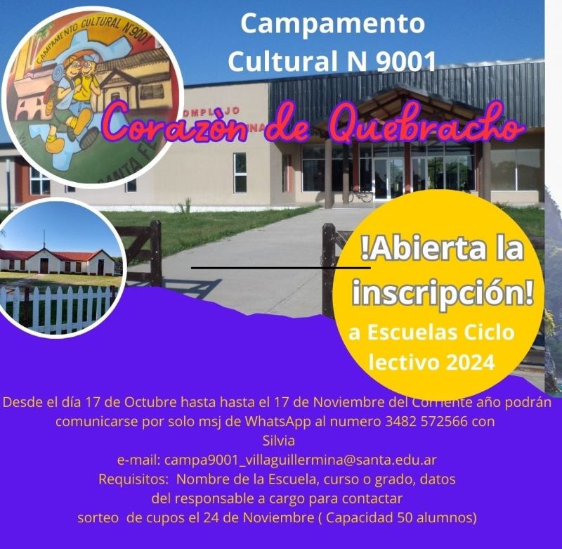 La dirección del Campamento Cultural N°9001 comunica que está abierta la inscripción para el ciclo lectivo 2024 para todas las escuelas desde este miércoles 17 de octubre, al viernes 17 de noviembre del corriente año.