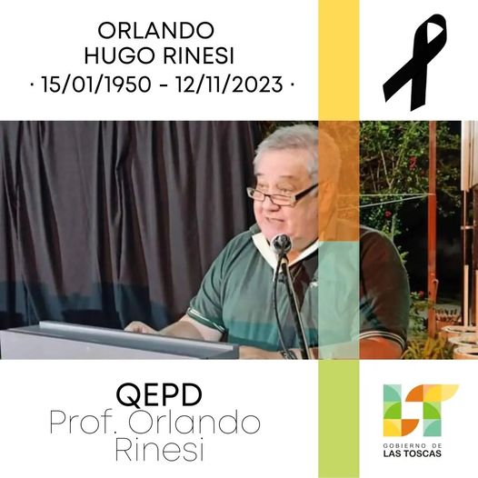 El Intendente Leandro Chamorro, en nombre de todo el Gobierno de la Ciudad comunica su profundo pesar por el fallecimiento del querido Profesor Orlando Hugo Rinesi y hace llegar sus sentidas condolencias a la familia de un gran referente y suscitador cultural de toda la comunidad de Las Toscas.