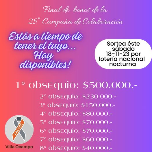 LALCEC Villa Ocampo informa que éste sábado 18 de noviembre es el sorteo final de los bonos de la 28° Campaña de Colaboración.