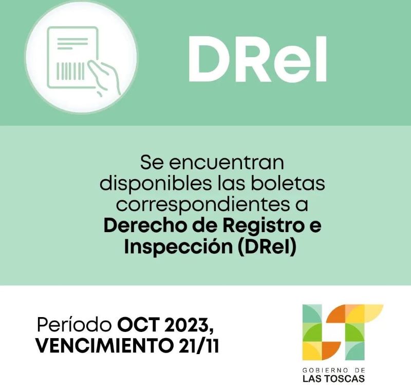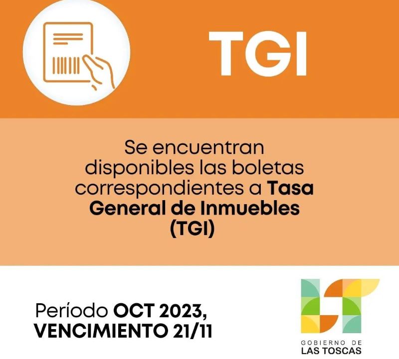 Desde el gobierno de la ciudad de Las Toscas informa a los contribuyentes que ya se encuentran disponibles las boletas de pago de DREI y TGI correspondientes al período de OCTUBRE.